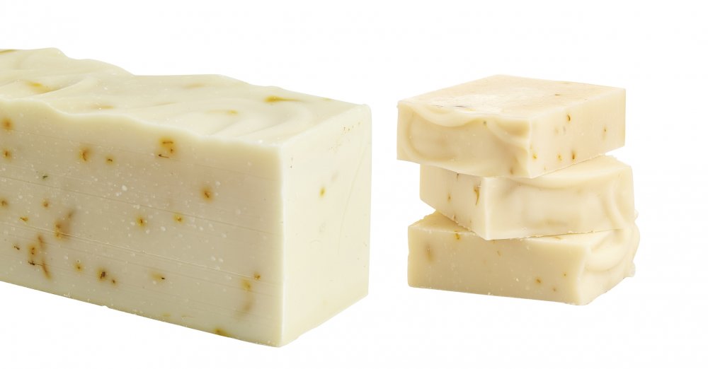 Håndlavet sæbe med morgenfrueblomster, tilsat kamille, der virker