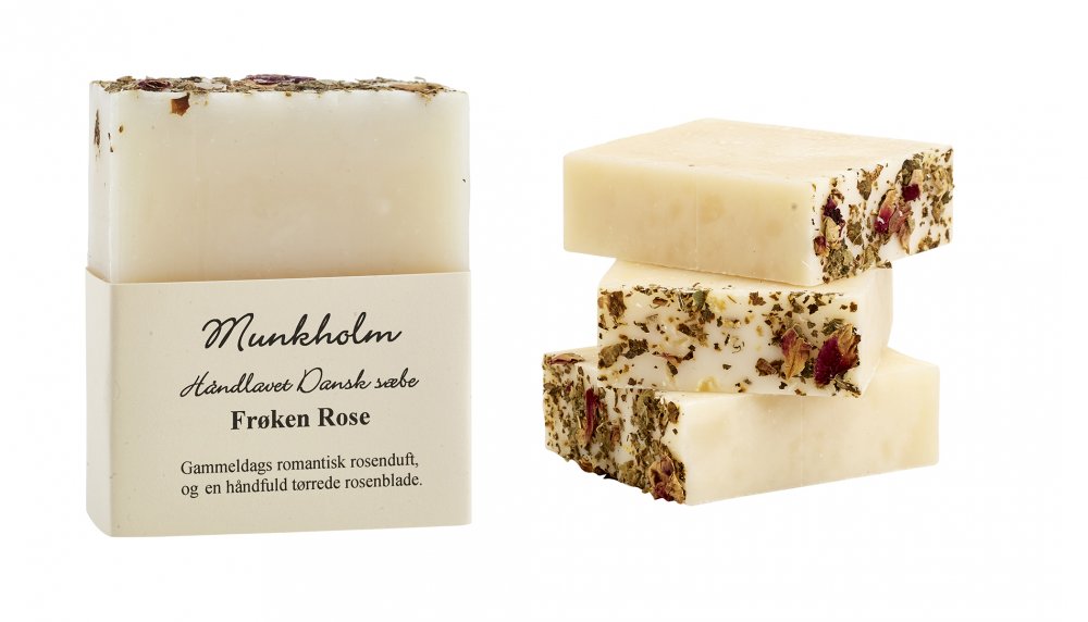 Håndlavet sæbe med en dejlig duft af gammeldags roser. Pyntet med et drys tørrede rosenblade.